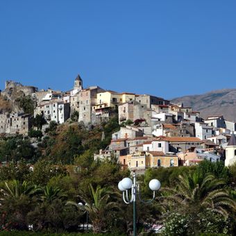 Scalea is a coastal town on the Tyrrhenian Sea that rises across terraced levels of a hillside below the Capo Scalea promontory, with narrow stone streets and ancient stone walls throughout. The older quarters sit above the beaches and overlook the shoreline below.