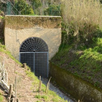 The Cocceio Tunnel extends for one kilometer through volcanic rock, featuring a trapezoidal cross-section and six ventilation shafts along its length.