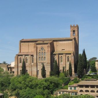 The Basilica of San Domenico sits on Camporegio hill with a striking brick façade and bell tower that define Siena's skyline. Inside, the space is organized with multiple chapels and side aisles that branch off from the central nave.