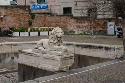 The Fontana del Leone stands as a stone fountain structure featuring ornate sculptures and architectural elements representing various mythological figures and symbols.