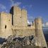 Castle of Rocca Calascio is a stone fortress located at about 1460 meters above sea level in the Apennines, with a central tower and four circular towers in the outer defensive walls. The structure displays the typical features of a mountaintop fortress with reinforced defensive barriers.