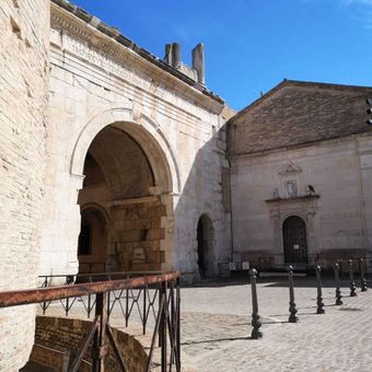 The Arch of Augustus is an ancient Roman gateway with a main arched passage and upper sections that once marked the city's official entrance. The structure features carefully carved stonework and maintains a solid rectangular frame supporting the archway above.