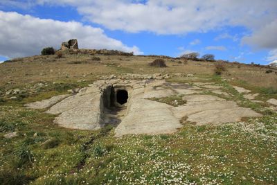 The necropolis contains four domus de janas tombs carved into tufa rock, featuring long entrance corridors that follow natural terrain slopes at 580 meters altitude.