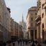 Corso Vittorio Emanuele II is a 380-meter pedestrian shopping street in central Milan connecting Piazza del Duomo to Piazza San Babila. Both sides feature covered arcades housing international brand stores and fashion boutiques, with a church in the middle and a major department store anchoring one end.