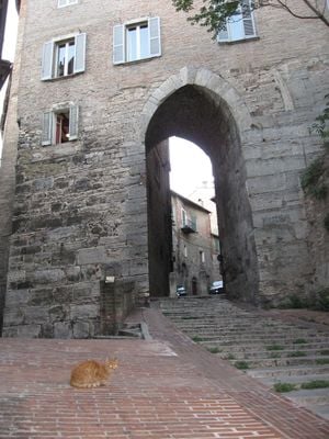This structure marks the eastern entrance of the ancient decumanus, connecting to Porta Trasimena and forming part of the five royal routes from Piazza Grande.