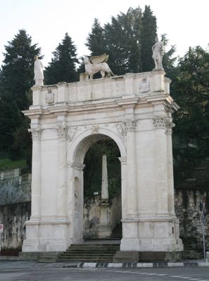 The Arco delle Scalette features detailed sculptures and marks the beginning of a stairway path leading to Monte Berico sanctuary.
