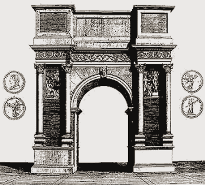 The stone arch featured a single passageway with pairs of columns on each side, spanning across the Via Lata in central Rome.