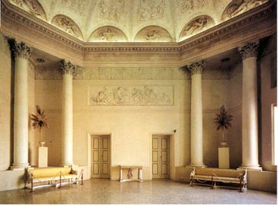 The palace contains a complete oval vestibule leading to a bathroom decorated with Ercolano-inspired artworks by Felice Giani.