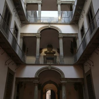 The interior spaces of Palazzo Huigens contain detailed frescoes and decorative elements that represent the artistic preferences of Italian aristocracy.