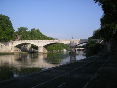 The Ponte Giuseppe Mazzini stretches 106 meters across the Tiber River, connecting the districts of Trastevere and Regola through three stone arches.