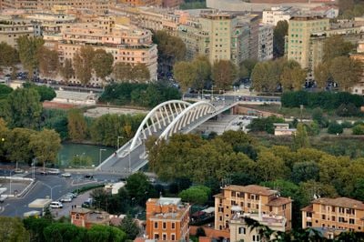 The steel and concrete structure spans 190 meters across the Tiber River, featuring two tilted arches without horizontal connections above the deck.