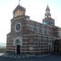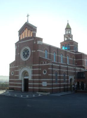 The sanctuary features a neo-Romanesque facade constructed with red stone and white marble, displaying a fresco of Madonna next to the risen Christ.
