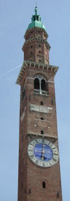 The Torre Bissara reaches a height of 82 meters and stands next to the Palladian Basilica in the central square of Vicenza.