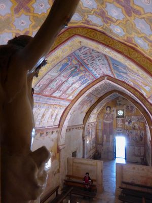 The interior walls of the oratory display medieval frescoes arranged in three registers, depicting scenes from Christ's life and San Pellegrino's stories.