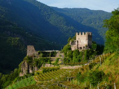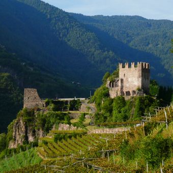 The Castle of Segonzano stands on a rocky elevation above the Avisio river, featuring remaining walls and towers from its original structure.