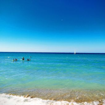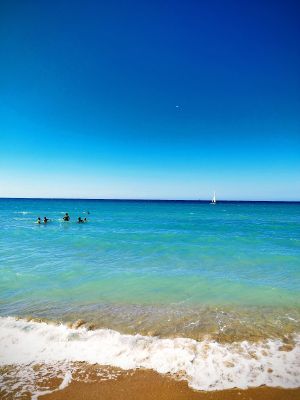 During summer evenings, the beach offers direct views of both sunrise and sunset over the Mediterranean Sea from specific vantage points.