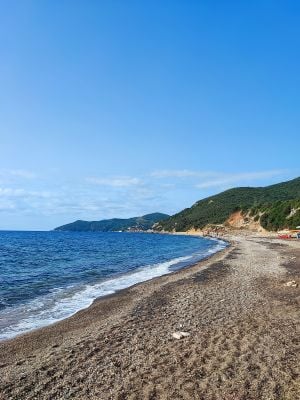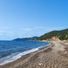 A small bar near the beach provides food service, sunbed rentals, and umbrella rentals, with free parking space located behind the beach.