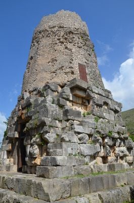 The tomb reflects Roman architectural practices through its circular funeral chamber containing six niches, vaulted ceiling, and central stone pylon supporting the upper structure.