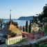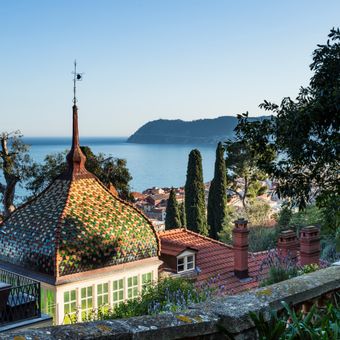 The villa sits on a hillside with Mediterranean gardens containing exotic plants and offers panoramic views across the Ligurian Sea coastline.