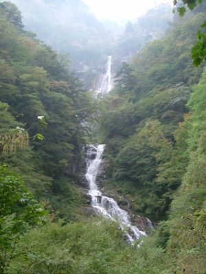 The three-tiered Kitashōji Falls cascades down a granite cliff, reaching a total height of 121 meters with a width of 35 meters.