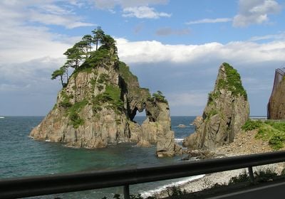 Tsurigane Cave is a natural sea cave on the Kosode Coast within Sanriku Fukko National Park, with its entrance facing directly toward the ocean. The open structure allows visitors to see the water and sky framed through the rock formation.
