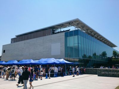 The aquarium operates daily from 9:00 AM to 5:00 PM and stands fifteen minutes on foot from Naoetsu Station on the JR Echigo-Tokimei Line.