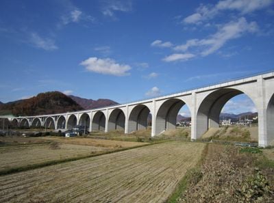 The Ueda Roman Bridge spans 0.7 kilometers across the landscape, featuring classical architectural elements and a sturdy concrete arch design.