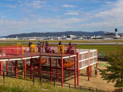 The park stretches along Osaka International Airport runway with connecting hills and observation points offering direct views of aircraft operations.