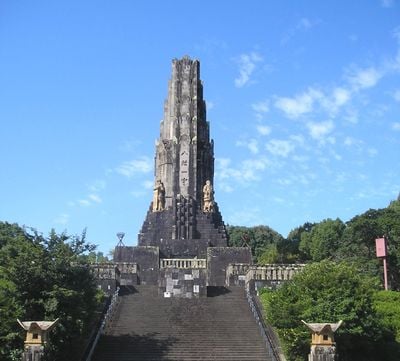 Built in 1940 to commemorate Emperor Jimmu, the Peace Tower initially displayed the inscription 'Hakko Ichiu' until its removal by United States authorities.