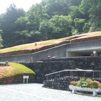 The semi-underground museum structure incorporates mine-like architectural elements, with a sloping roof covered in Satsuki azaleas that bloom each May.