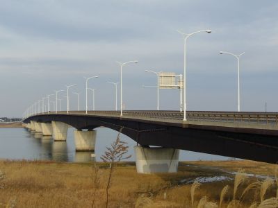 The Tonegawa Kamome Bridge extends 1,050 meters across the Tone River, connecting the city of Choshi with the village of Katori in Chiba Prefecture.