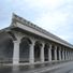 The continuous semicircular arcade features thick concrete columns with 8-meter spacing, creating patterns of light and shadow across the promenade floor throughout the day.