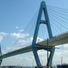 The Meiko Bridge stretches across the port area of Nagoya with supporting cables extending from central towers to hold the roadway structure.