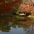 The garden features a central pond crossed by a wooden bridge, surrounded by maple trees and traditional pathways within Wakayama Castle grounds.