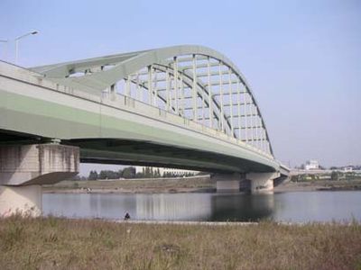 The Tamasuidō-bashi extends 358.8 meters across the Tama River, connecting the regions of Komae and Tama-ku with its arch bridge construction.