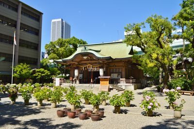 The shrine features traditional architectural elements, including a torii gate entrance and multiple structures within its grounds in central Osaka.
