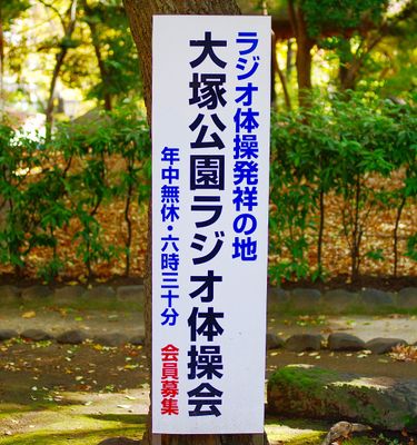 Local residents participate in radio taiso exercises broadcast by NHK, maintaining a Japanese tradition of morning group physical activities.