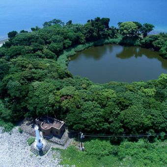 Kamiike is an artificial pond located within a shrine on the coast near Numazu. The water body spans a notable width and is bordered by pathways that allow for exploration around its perimeter.