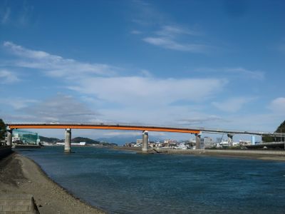 The bridge's orange support structures reflect traditional Shinto design elements, incorporating local architectural principles into modern engineering.