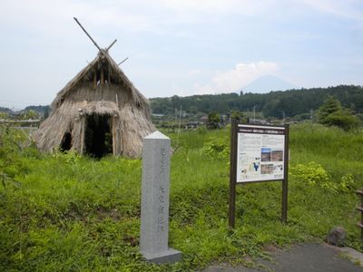 The archaeological site stands one kilometer from Fujinomiya Station, with a stone marker and information placard providing details about the ancient settlement.