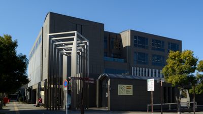 The Nara City Library maintains collections of books, documents, and digital resources within a modern building in the historical district of Nara.