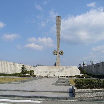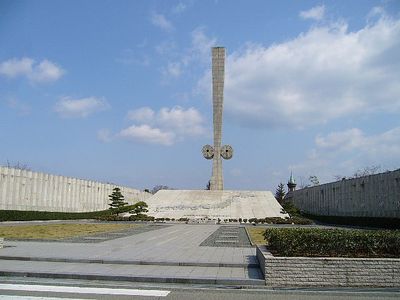 The cenotaph rises 26.75 meters above Tegarayama Central Park, featuring a sword design that represents the commemorative nature of this memorial structure.