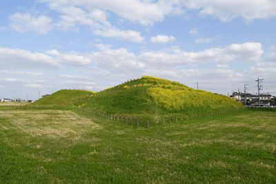 The Shōgun'yama Kofun features a distinct shape combining a circular front section connected to a rectangular rear part, measuring several hundred meters in length.