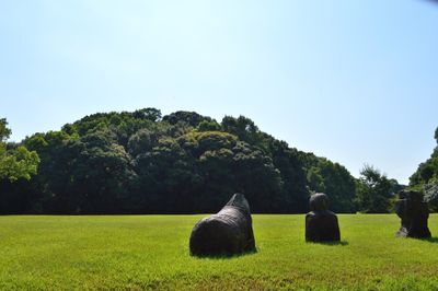 Terracotta figures called haniwa line the edges of the tomb, depicting human forms and animal elements that reflect ancient Japanese burial traditions.