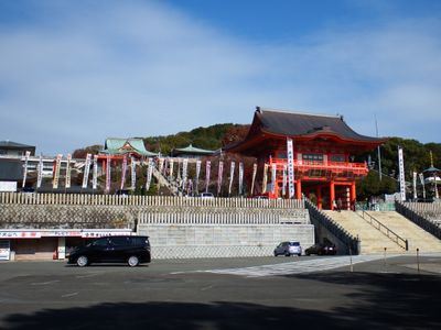 Daishō-ji is a Shingon Buddhist temple with red timber structures and green copper roofing positioned on a hillside overlooking the Kiso River and Inuyama Castle. The grounds include extensive parking facilities and dedicated spaces where vehicle blessing ceremonies take place.