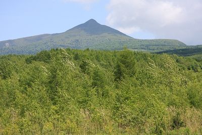 Mount Tokushunbetsu rises to an elevation of 1,309 meters, featuring steep slopes and natural trails through dense vegetation in northern Hokkaido.