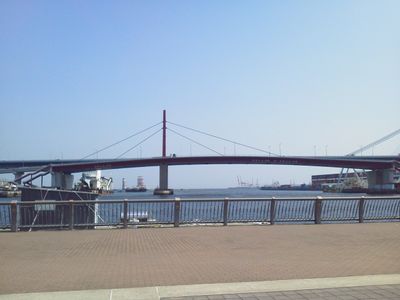 The bridge includes a 3-meter wide pedestrian walkway and operates with vehicle access, connecting industrial and commercial areas of Kobe Port.