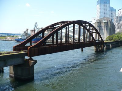 The rusty steel bridge spans across the Harumi canal, connecting the Harumi and Toyosu areas within the Tokyo metropolitan region.