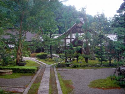 The temple buildings feature traditional Japanese architectural elements with curved roofs, wooden beams, and ornate decorative details throughout the structure.