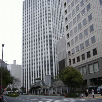 The Yokohama Tenrikyo building is a modern skyscraper incorporating traditional Japanese design principles, with vertical lines and symmetrical patterns defining its appearance. The structure blends contemporary architecture with classical elements visible throughout its interior and exterior surfaces.